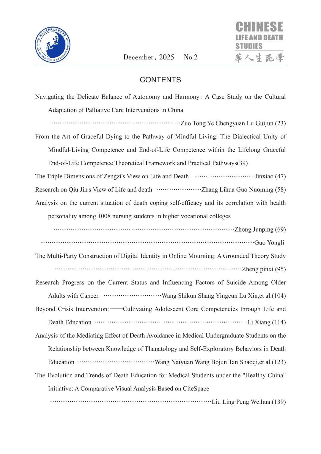 2025年《华人生死学》期刊的第2期文章已经全部上线,欢迎广大同仁关注,文章详情可以参看官网: